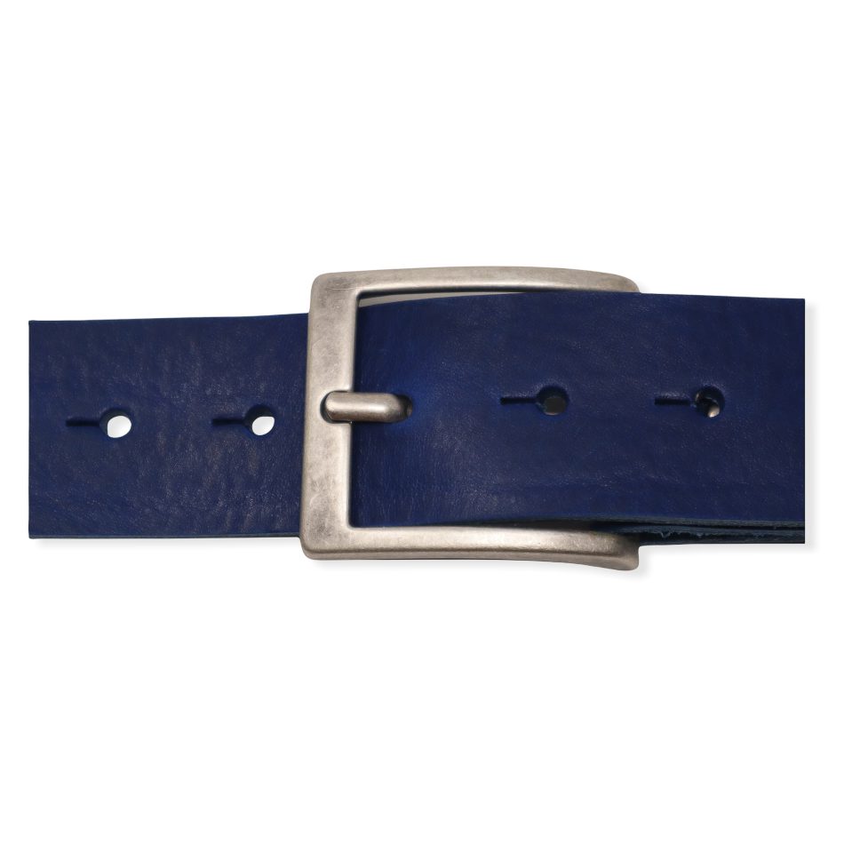 This mens blue leather jeans belt has been handmade in Devon from full grain, Italian tanned English bull hide. The brushed silver buckle is made from Zamac, an alloy of zinc, aluminium, magnesium and copper.